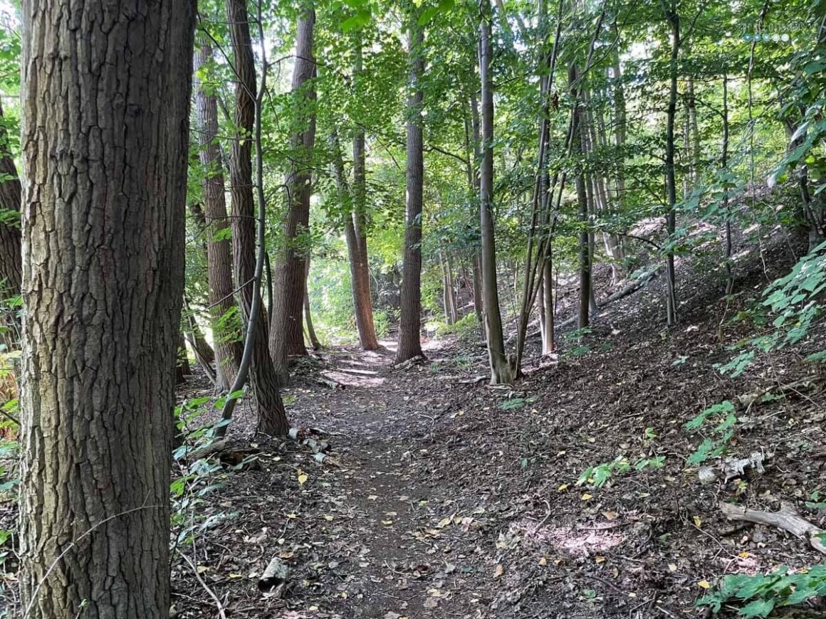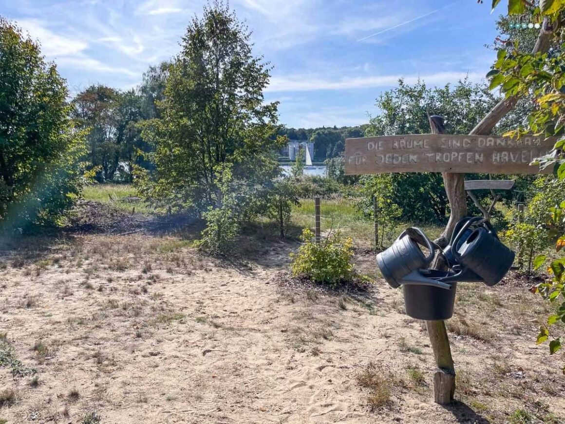 We kept on walking along the lake and enjoyed the forest and water views. We stumbled upon this arbory monument. Planted as a growing reunification monument were three trees – one for East German (a pine), one for West Germany (a beech) one for all of Germany (an oak). Annual they add the tree of the year. And ask passerby to water the trees. Of course we did.
