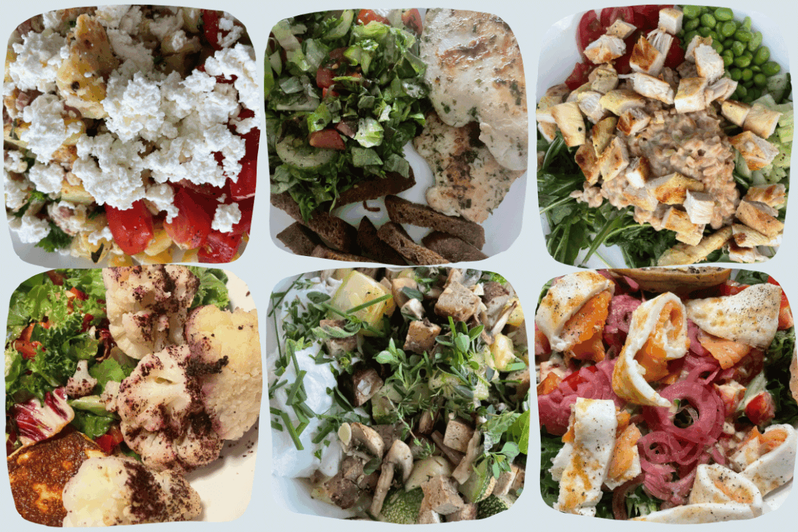 Also a lot of salads made it on the table this year. Often with chicken (top right) or tofu (bottom middle) or grilled cheese (bottom left). Once I got fancy and made eggs sunny side up added salmon and rolled it up (bottom right)