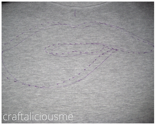 Das T-Shirt bügeln. Schablone auflegen (Achtung: mittig!) und mit einem Kreidestift auf das Shirt übertragen.