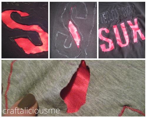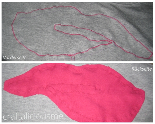 Vorsichtig das Shirt innerhalb der genähten Flächen ausschneiden, so dass euer druntergelegte Neonstoff zum Vorschein kommt.