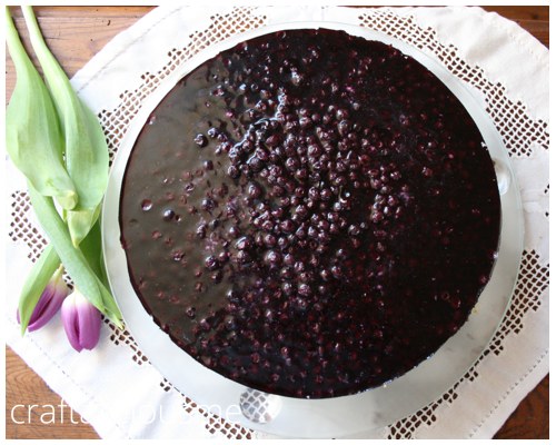 Now prepare gelatin as said on packaging instruction using the blueberry juice. Once it starts to set add the berries and wait just a bit longer until the juice mixture can still be poured but is almost set. Add on top of your cake. Make sure to use a cake ring otherwise the blueberries are everywhere but your cake ;-) Let cool until mixture is completely set.