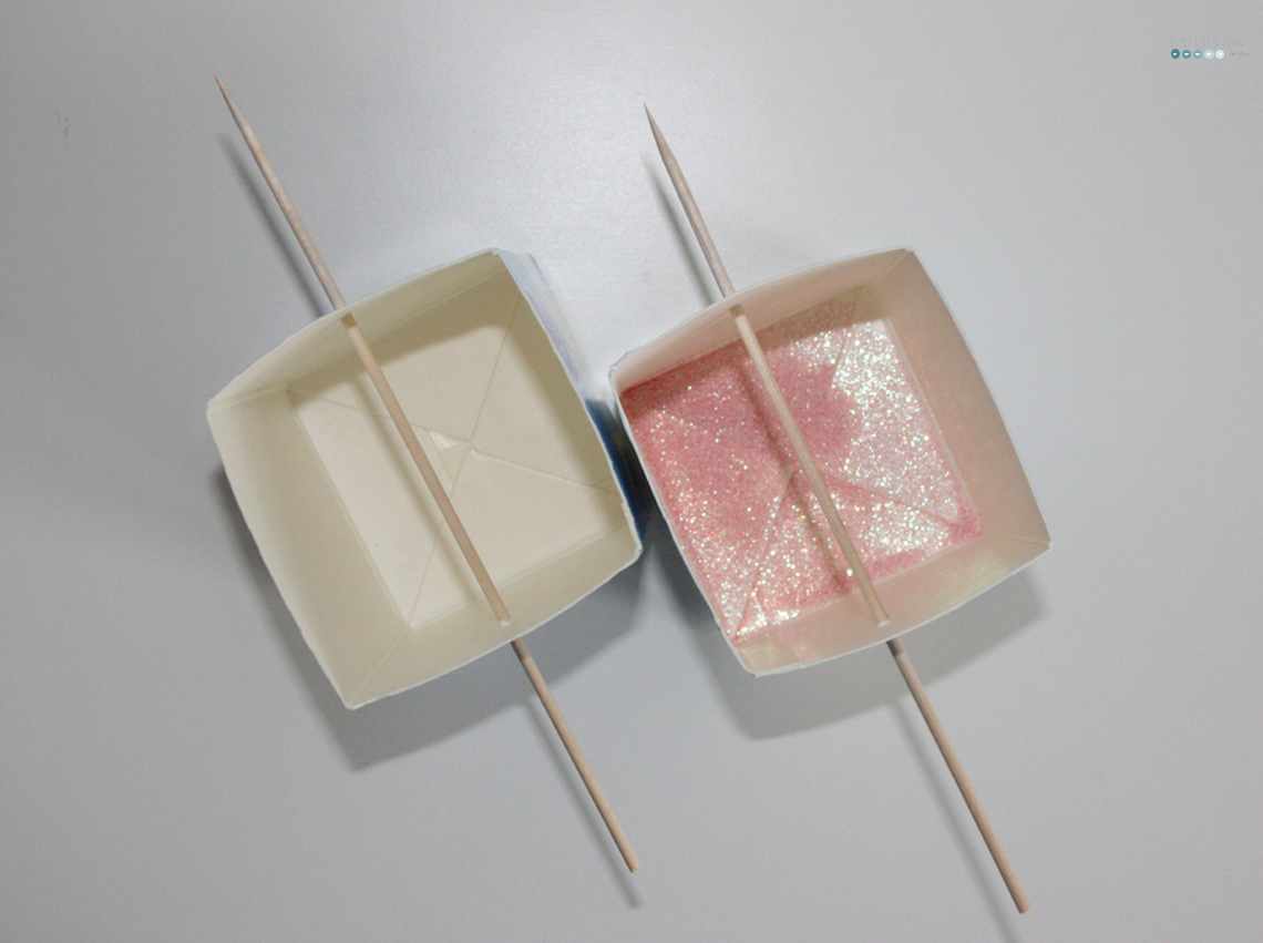 6. While you wait, cut up tetra packs. They should be a bit higher than your candlewick is long. Push your wooden sticks through your tetra pack. They will support the wick from moving/drowning once the wax is filled in.