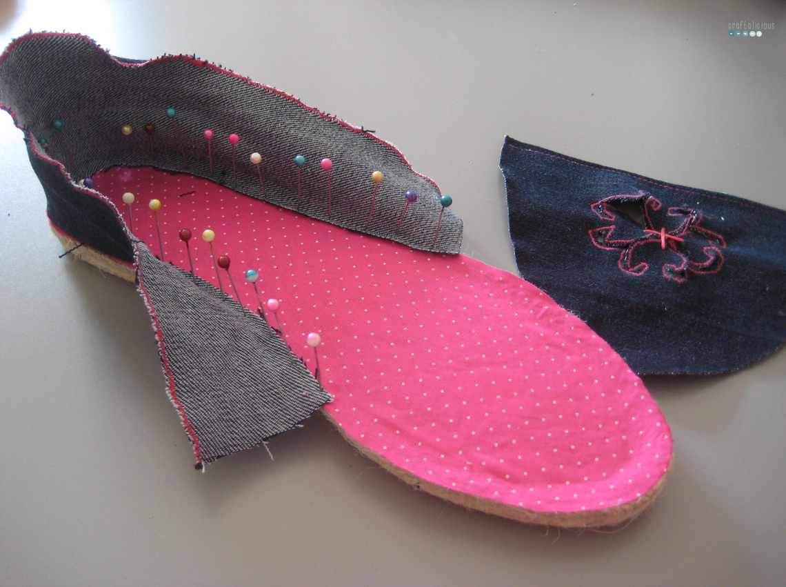 Assemble your pieces. I used textile glue to attach the pink dotted fabric to the sole and then pin needles became my best friend.