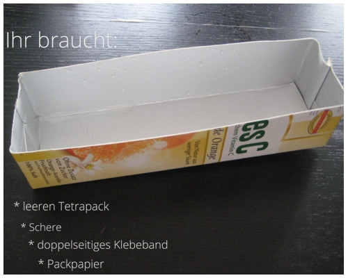 What you need: empty tetra pack, scissors, tape, craft paper.
