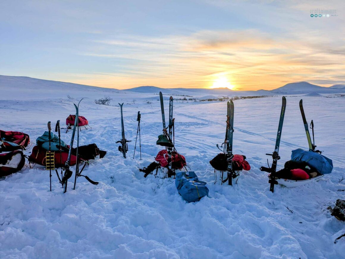 What happened: woke up to clear blue sky, breakfast in community hall with eggs and bacon, coffee and tea, distribution of snacks – everyone could take as much as needed from stash mainly nuts, muesli and protein bars some chocolate and cookies, also choosing dinners of last two nights track and eat, packing last things, cleaning community area, washing dishes, loading pulkas, moving stuff that stayed in base camp to their cabin, filling up all thermos and water bottles, hop in car for drive to expedition starting point in Nikkiluokta, arrival at 2pm, last bathroom before the wild, start ascent, steeper than anticipated, after about 1.6km removed ski and continued on foot, needed many breaks, in the end – and being last – someone was sent back to help me pull pulka ending up taking it completely, arrival in camp exhausted at around 5.30pm (?), tent almost build up, fire didn’t really start, watching polar lights while waiting for dinner, calling husband, building sleep place and pumping up air mattress, finally dinner at 10.27pm, realizing I lost my sports bra – tried to dry on my body but it must gave fallen out, stressed me immensely, but getting into sleeping bag, couldn’t calm down, bad sleep, one bathroom break