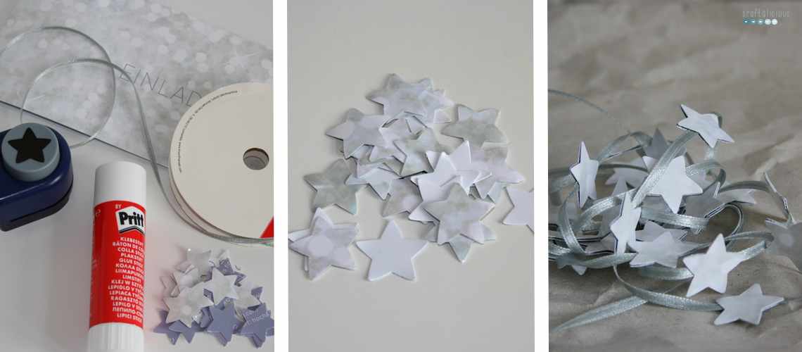 The how to is quite simple. Punch a bunch of stars out of the paper while watching one of the best Christmas movies. Then glue the stars to the ribbon leaving even spaces in between. I always glued to stars together and having the ribbon between them.