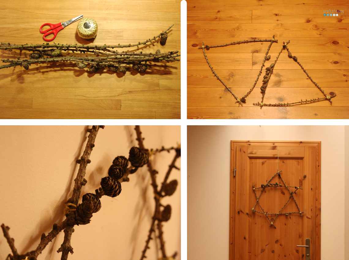I collected six twigs and cut them to same size length. Get some yarn or pretty ribbon and bind together two triangles. When you have those done, bind them together and you have a 6-peak-star.