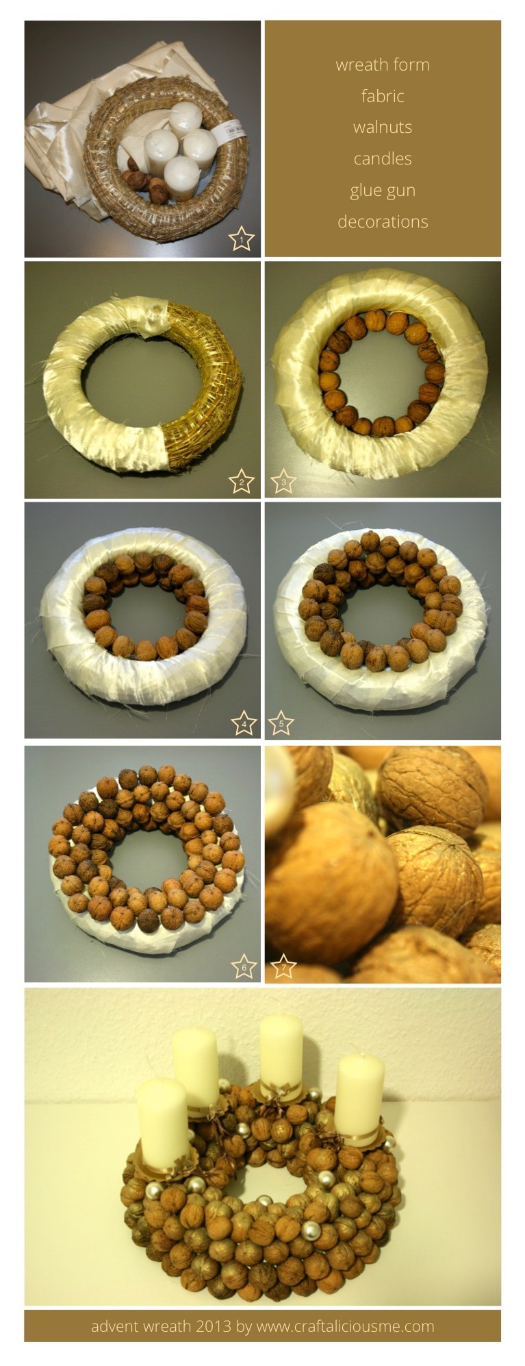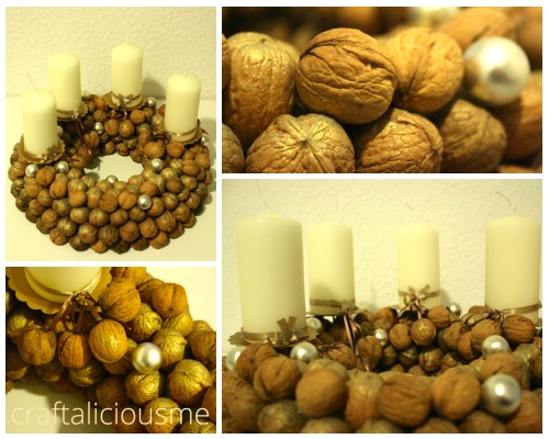 I am still in love with the candy versions but didn’t feel like hunting down the best candy. One day I will make a wreath like those but not 2013. Then I really wanted to the pom pom wreath. Well in the end I used the materials that were handy to come by. Walnuts. So 2013 it is a walnut advent wreath. I’ve put together a tiny photorial. Hope you like it.