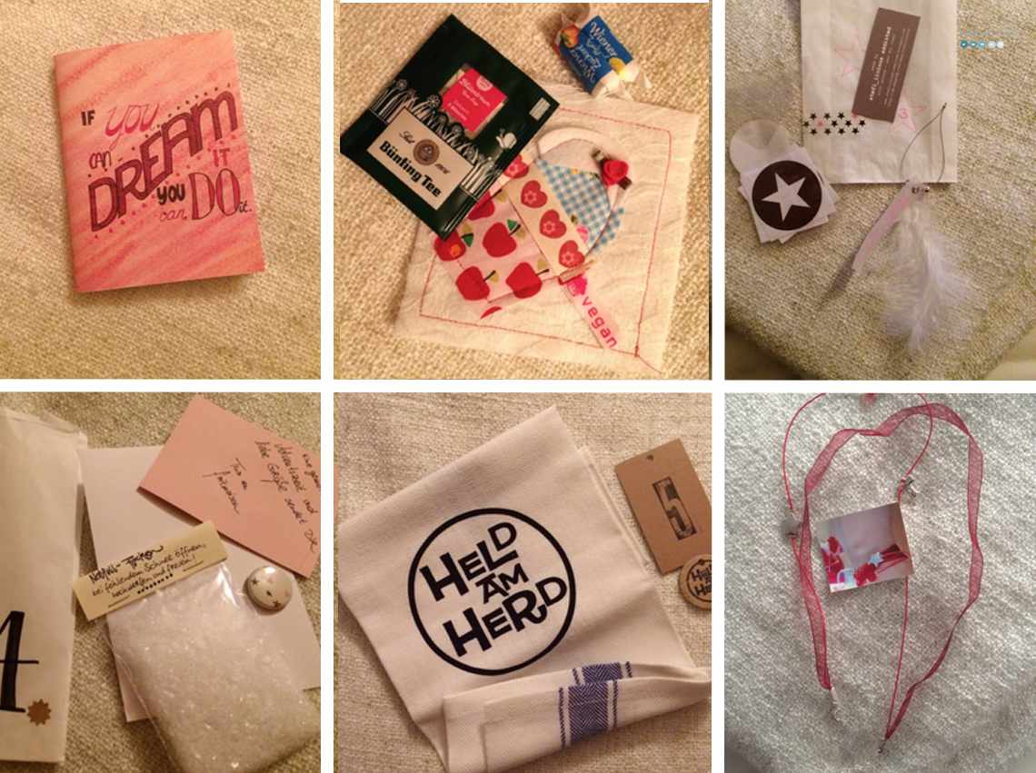 #1: Carmen made a notebook; #2: Sylvie sewed a coaster; #3: Stefi caught a feather and made it into an ornament; #4: Tina packed some emergency snow; #5: Sabine prepared us for kitchen duty ofer X-mas; #6: Inga gave us an adorable bracelet