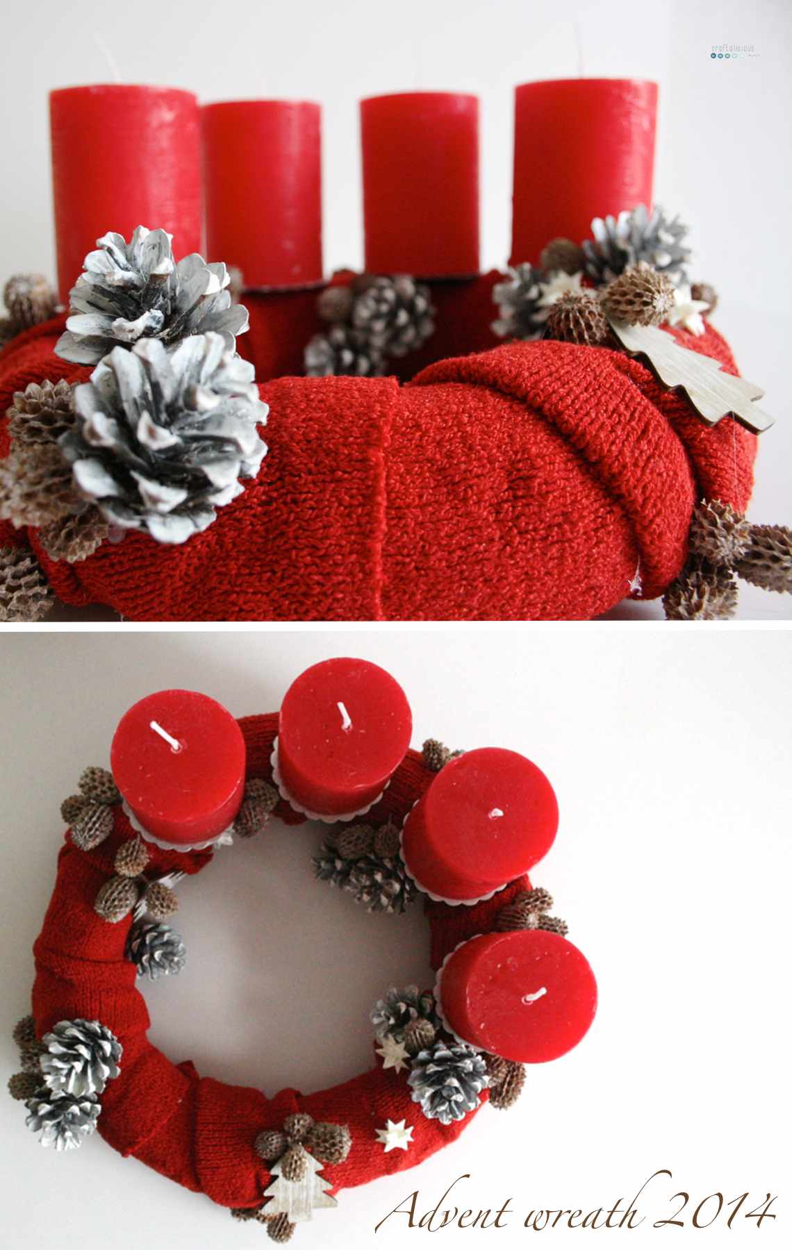 First of we start with the annual advent wreath I made my mom. This year I donated one of my favorite red sweaters. Since it has been in my closet for over 15 years I decided it need new challanges.